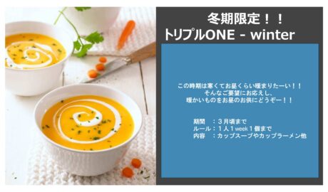 トリプルONE~winter~ 2026-01-28 On: 2026年1月28日 弊社で行っているトリプルONE『1人、1日、1本程度』ジュースの支給。それがこちら↓ この度wint […]詳しく見る →